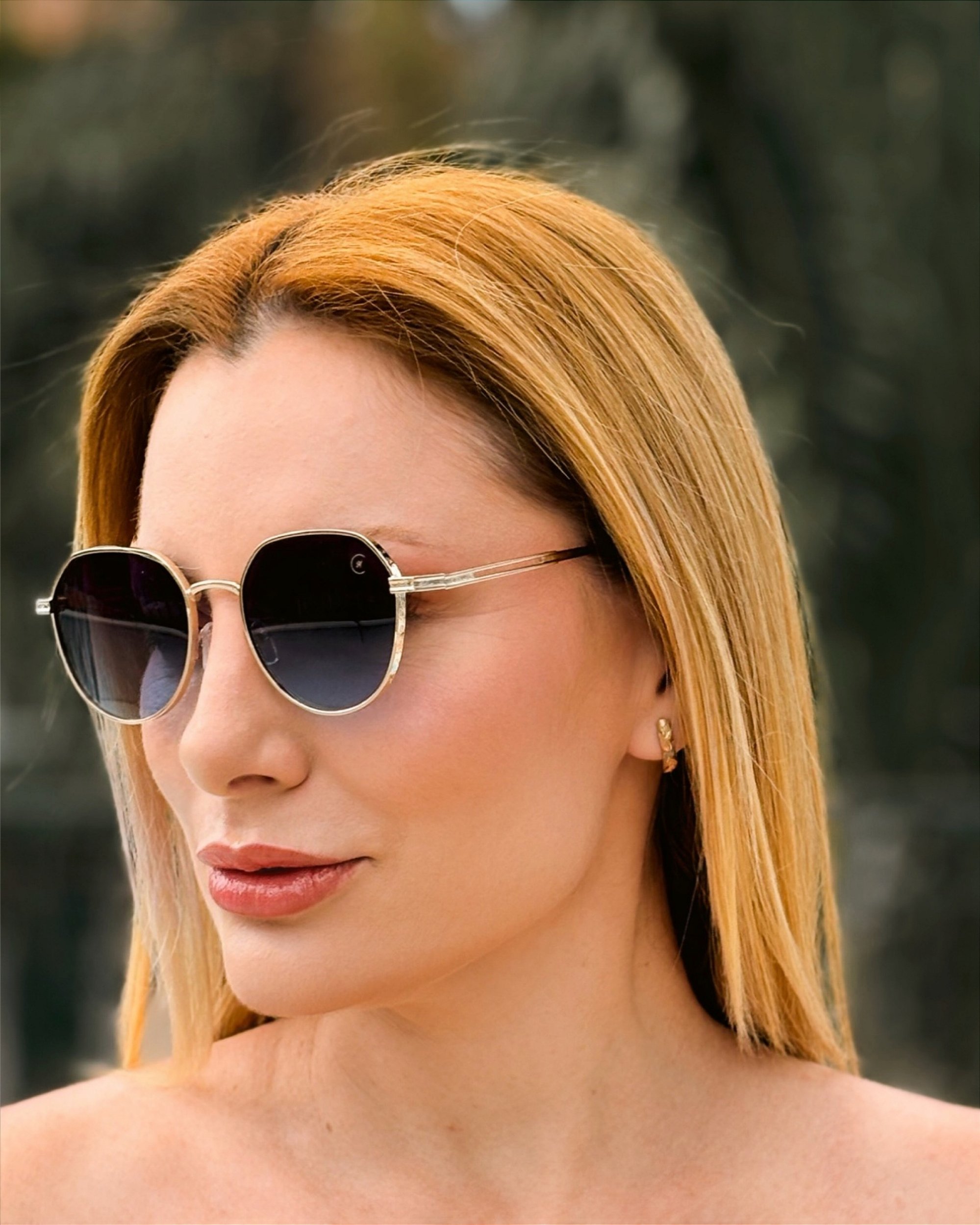 Conheça o Óculos de Sol Azul Degradê com armação dourada, perfeito para proteger seus olhos com estilo e garantir conforto em ambientes externos. Este modelo apresenta lentes em tom azul degradê, que aliadas à armação dourada conferem um visual elegante e moderno. As lentes filtram a luz solar, protegendo contra raios UV e garantindo uma visão clara e confortável durante o dia.