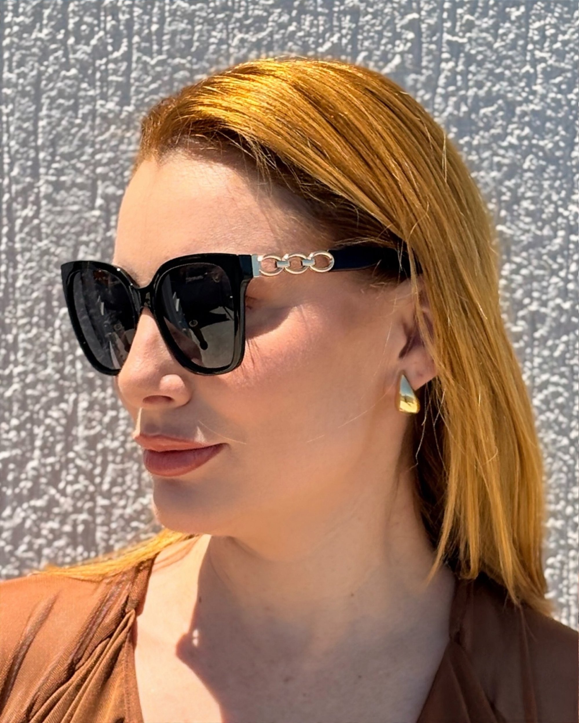 ÓCULOS DE SOL PRETO LENTE PRETA HASTE TRANCADA EM DOURADO